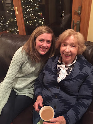 We had Christmas dinner at my brother's house, which is where hubs, Daughter2 and I were staying and it was really nice not to have drive anywhere. We had a fantastic German meal and my mom's wonderful cookies for dessert. I tried to get a picture of my mom with her daughters, but one of us likes to make us all laugh so this is the best I could do.