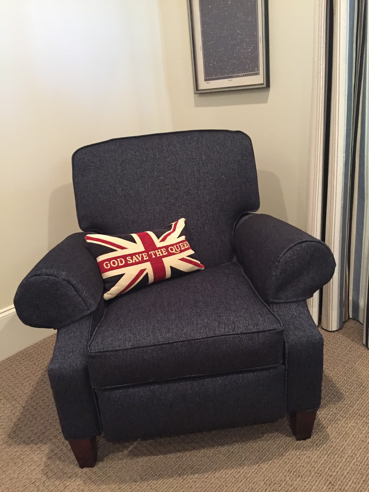 The guest room where the newly covered recliner now sits has navy bedding and a window treatment with some navy in the stripe. It looks like a brand new chair to me.