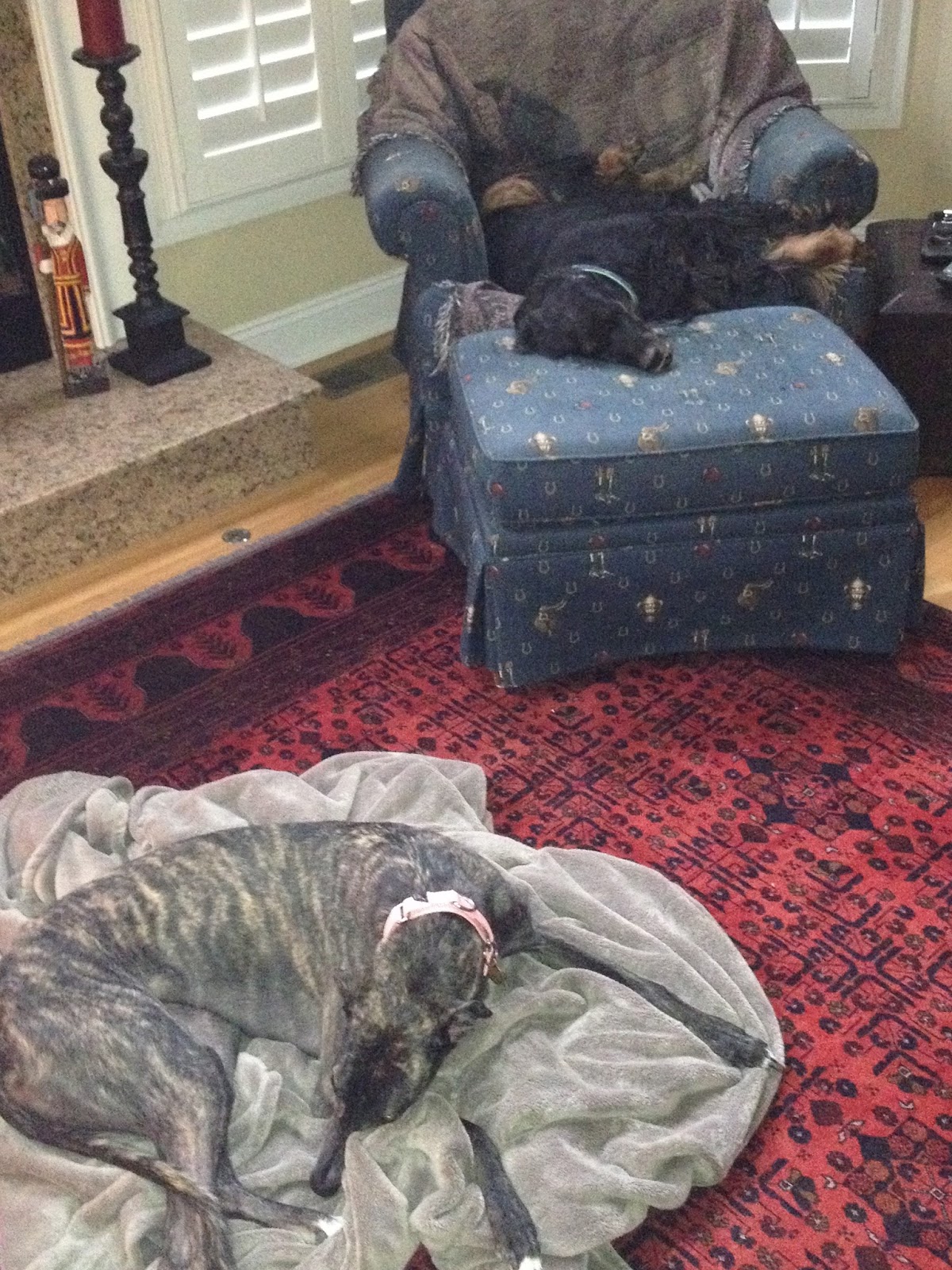 The other chair we had recovered is what we lovingly refer to in our house as the dog's chair. Our pup claimed the most comfortable seat in the house from day one, and we gave up trying to coax her out of it. This chair was her happy place until the day we had to tell her goodbye. That's Daughter2's dog in a blanket on the rug, which is her happy place.