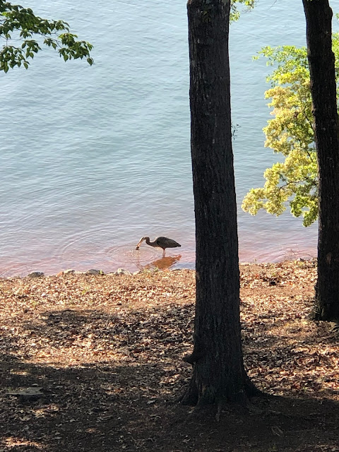 13. Hubs and I were enjoying our coffee the other morning when we spied a beautiful blue heron on the shoreline. He started making his way across the width of our property with his eye on something we could not see.